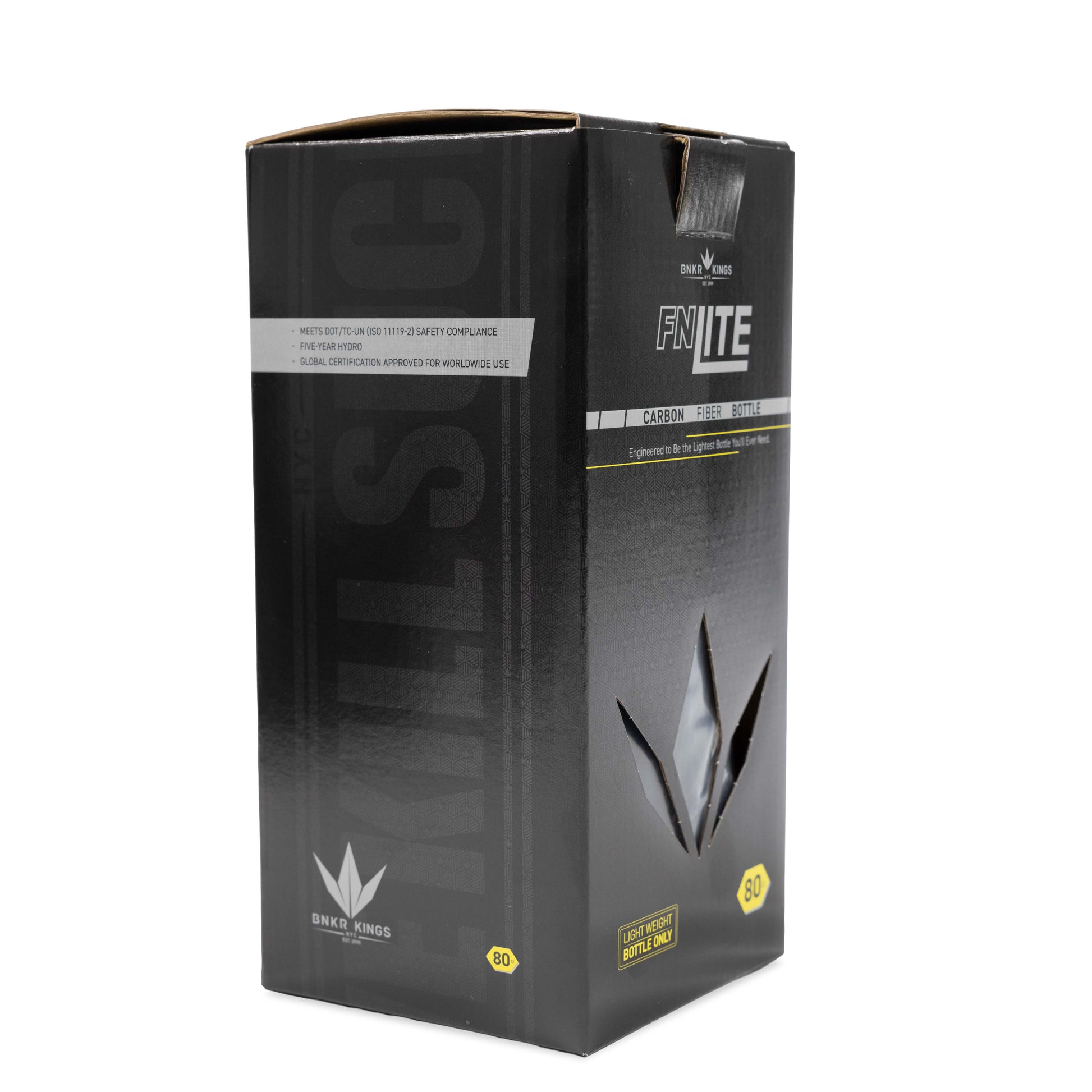 We've designed the the FNLite bottle to be up to 10% lighter and 9% shorter than the competition while still delivering the same number of shots with no loss in capacity? How do we do it? By using a proprietary DOT/ISO certified carbon fiber wrapping technology around an aluminum liner, the FNLite shaves off weight and increases the inner volume at the same time.